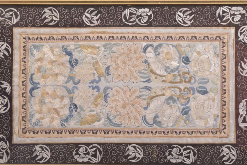 A CHINESE EMBROIDERED TEXTILE PANEL, embroidered with large flower heads, mounted with later embroidered border, framed and glazed, overall 36cm x 59cm.