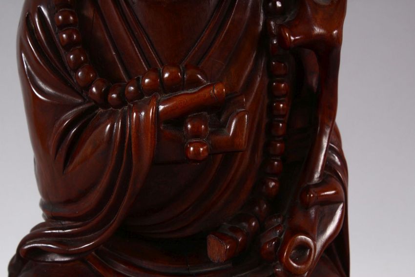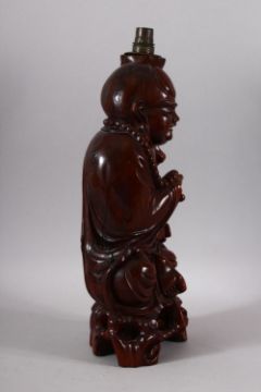 A CHINESE CARVED HARDWOOD FIGURE OF SHOU LAO - as a lamp - 42cm