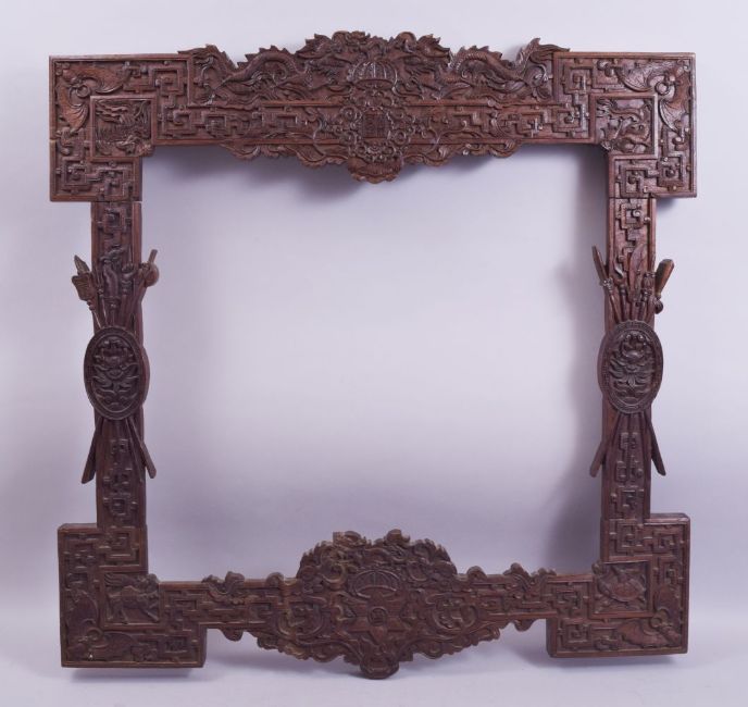 A GOOD LARGE CHINESE CARVED HARDWOOD FRAME, carved with dragons, phoenix, bats and emblems, the central top panel with carved seal, 75cm x 73cm.