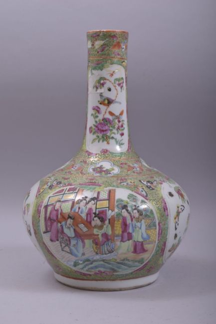 A CHINESE CANTON FAMILLE ROSE PORCELAIN BOTTLE VASE, painted with panels of figures, birds, butterflies and native flora, 34cm high.