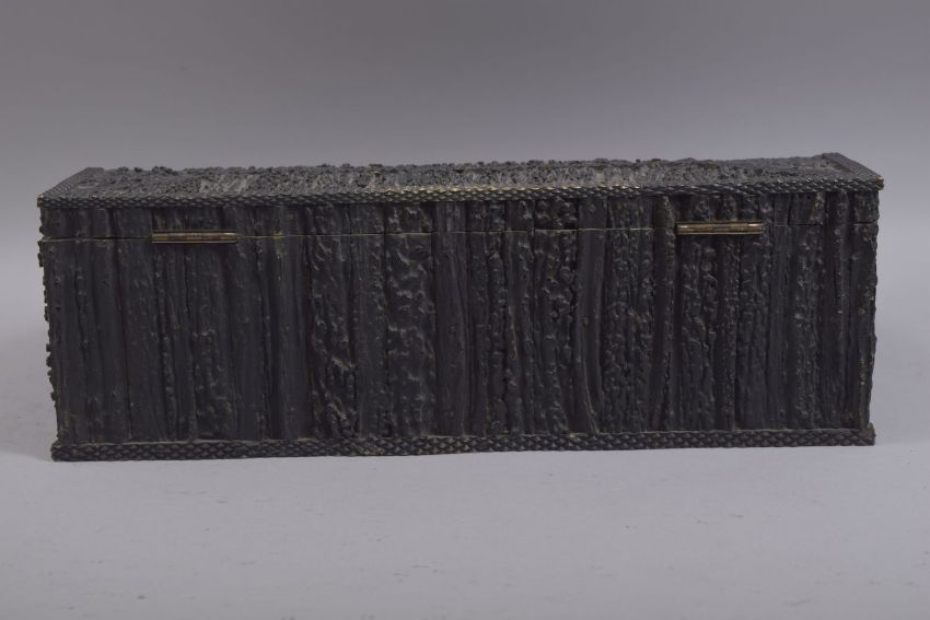 A LARGE INDIAN STAGHORN VENEERED WRITING SLOPE, the interior with sandalwood compartments and ivory, the slope with a band of penwork on ivory surrounding a velvet panel, the hinged lid open; 47cm x 38.5cm.