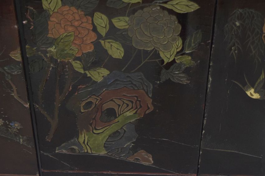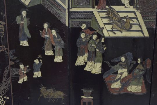 A CHINESE FOUR PANELLED LACQUERED WOODEN SCREEN, the screen with a courtyard scene with numerous figures including musicians, dancers, children and animals with a border of scrolling cherry blossom, the reverse decorated with birds and various flora, overall screen 183cm high, 163cm wide.