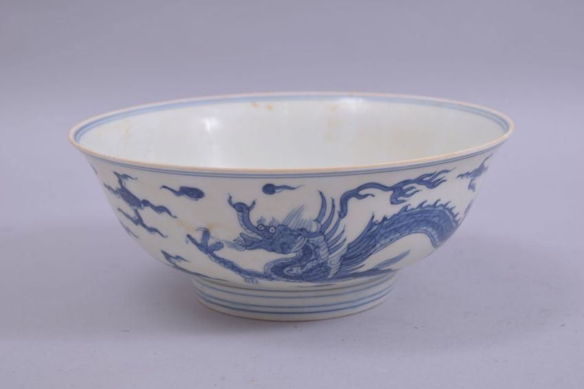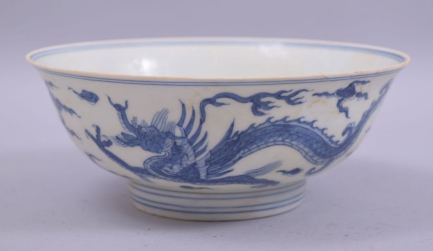 A CHINESE BLUE AND WHITE PORCELAIN DRAGON BOWL, the exterior painted with two dragons amongst stylised clouds, the interior further painted with a roundel containing a dragon, six character mark to base, 18.5cm diameter.