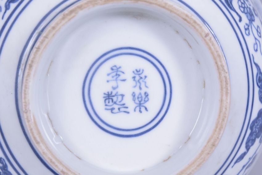 A CHINESE MING STYLE BLUE AND WHITE BOWL, the exterior painted with peach and pomegranate decoration, with a yellow glaze to the interior and further decoration including lotus, with four character mark to base, 20cm diameter.