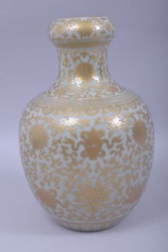 A GOOD CHINESE CELADON GLAZE AND GILT DECORATED GARLIC HEAD VASE, the body painted all over with flower heads and precious object, six character to base, 27.5cm high.
