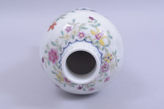 TWO CHINESE STYLE FAMILLE ROSE PORCELAIN VASES, together with a famille rose porcelain twin peach, vases 25cm and 24cm, peach 11cm wide (3).