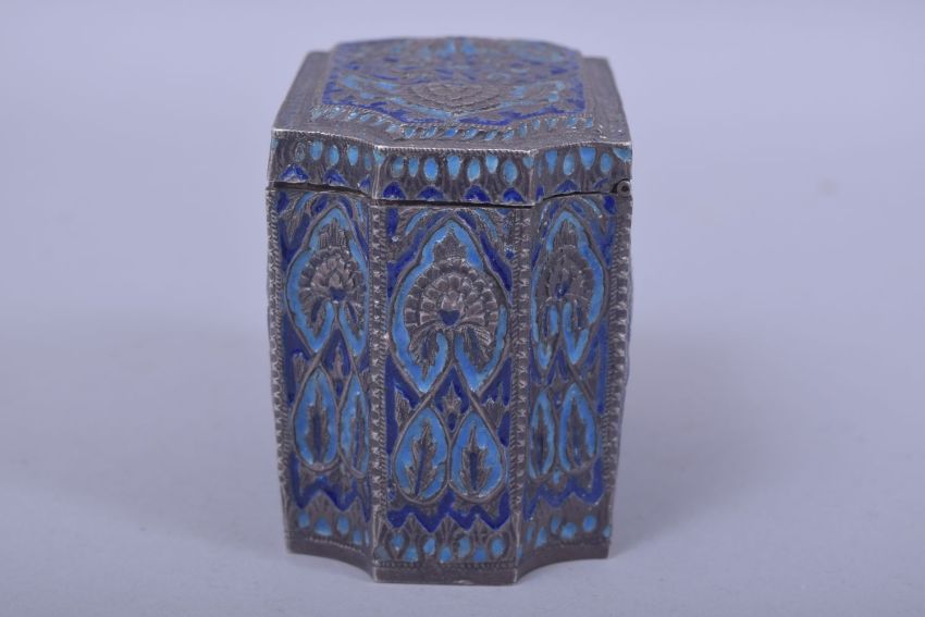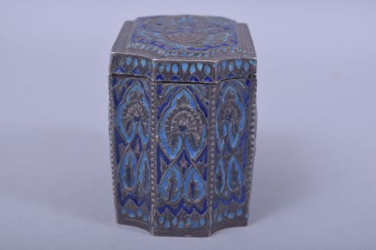 A FINE 19TH CENTURY INDIAN KASHMIRI ENAMELLED SILVER TEA CADDY, with embossed and chased floral motifs and further decorated with blue enamels, 8cm high, 10cm wide, 6cm deep.