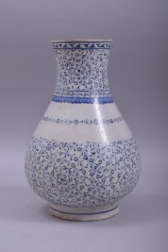 A TURKISH IZNIK GLAZED POTTERY WATER JUG, decorated with bands of scrolling foliate design, 25.5cm high.