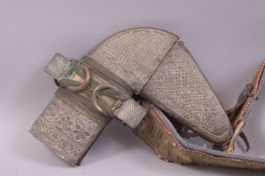 A LATE 19TH CENTURY YEMENI JAMBIYA, the curving blade 17cm with a raised central ridge, the hilt with white metal mounts, contained within a copper and leather wrapped wooden scabbard decorated with foliate and geometric designs, complete with belt, overall dagger length 25cm.