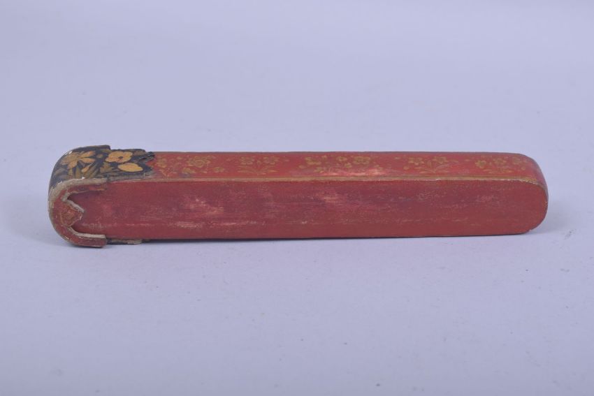 A 19TH CENTURY PERSIAN QAJAR LACQUERED PAPIER MACHE QALAMDAN PEN BOX, with floral decoration, 23.5cm long.