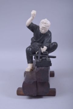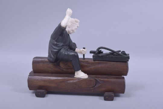 A JAPANESE MEIJI PERIOD MIXED MEDIA OKIMONO - WOODWORKER, the man formed from bronze and ivory whilst working timber with his bronze tool tray aside, 22cm high, 25cm wide.