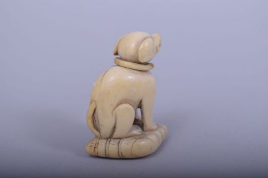 A JAPANESE MEIJI PERIOD CARVED IVORY NETSUKE - DOG AND SHELL, the dog sat in recumbent pose upon a clam shell, with reticulated collar, 4cm.