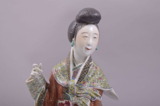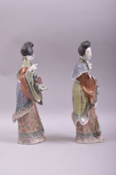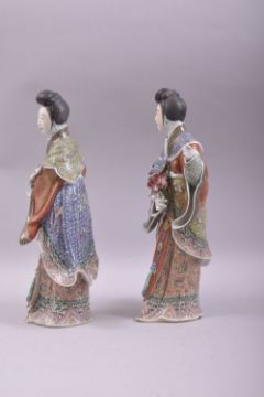 A PAIR OF JAPANESE PORCELAIN FIGURES of geishas, each wearing well modelled and painted robes, 30cm high.
