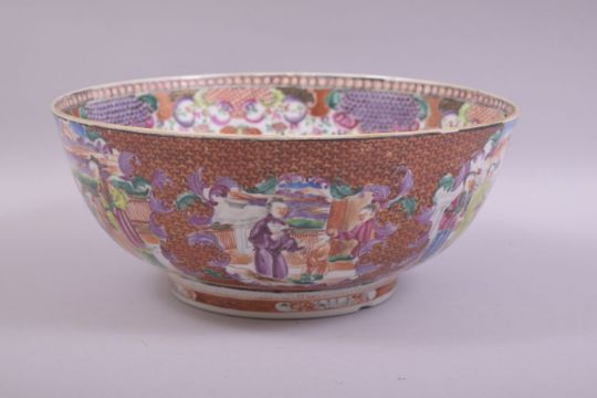 A LARGE CHINESE MANDARIN FAMILLE ROSE AND IRON RED PORCELAIN BOWL, painted with panels of figures in various settings, 29cm diameter.