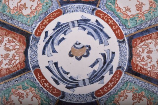 A LARGE JAPANESE IMARI PORCELAIN CHARGER, painted with floral panels in the imari pallette, the centre with a blue, white and gilt design, four character mark to base, 46.5cm diameter.
