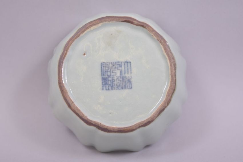 A SMALL CHINESE CELADON GLAZED DISH, the base with six character mark, 11cm diameter.