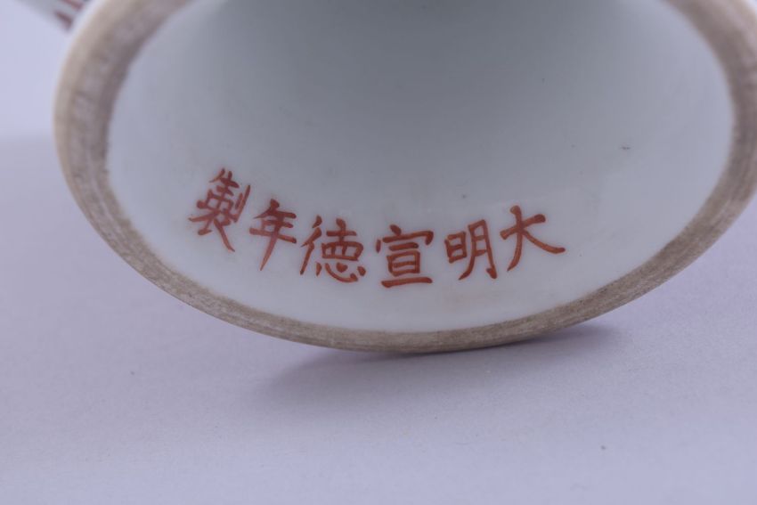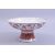 A CHINESE MING STYLE CORAL RED PORCELAIN PEDESTAL DISH, the exterior painted with lotus and scrolling vine, with six character mark to inner foot rim, the dish 19cm diameter.