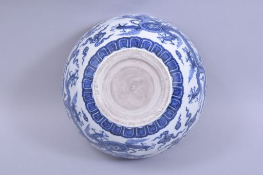 A LARGE CHINESE MING STYLE PORCELAIN BOWL, the exterior painted with dragons and stylised clouds, the interior with xuande mark central, 26.5cm diameter.
