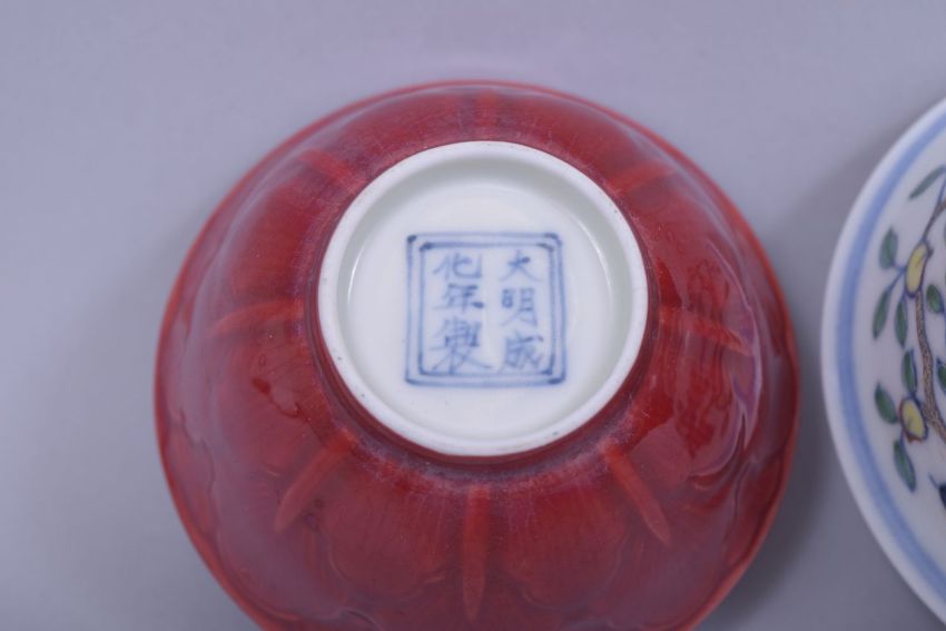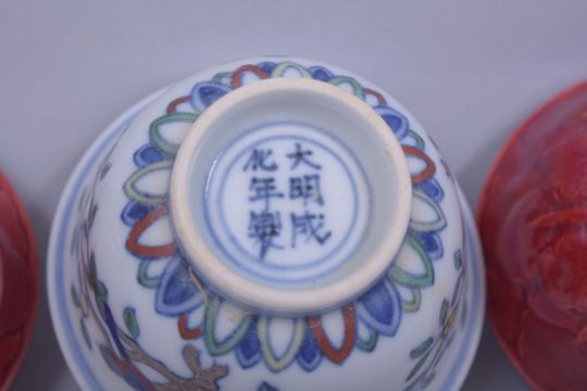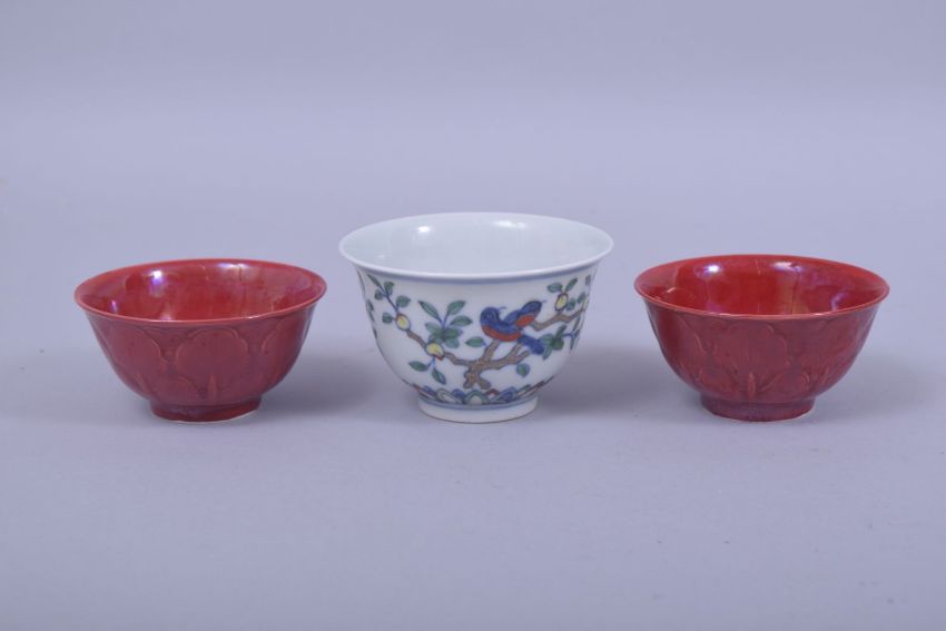 THREE CHINESE PORCELAIN TEA CUPS, including one cup in the doucai palette with six character mark and a pair of red glaze cups with six character mark to base, 8cm dia. and the pair 7.5cm diameter (3).