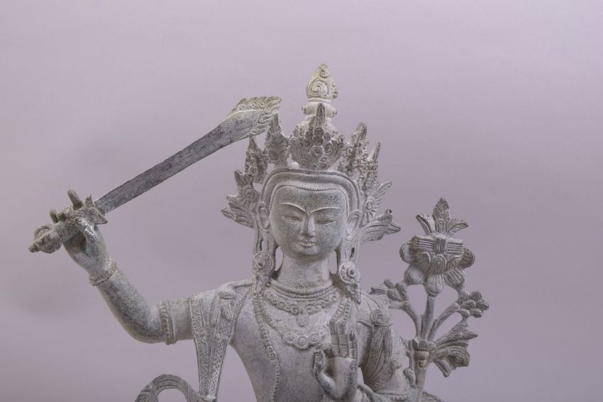 A LARGE BRONZE FIGURE OF A DEITY HOLDING A SWORD, 38cm high.
