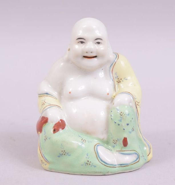A SMALL PORCELAIN FIGURE OF A SEATED HOTEI, 8cm high.