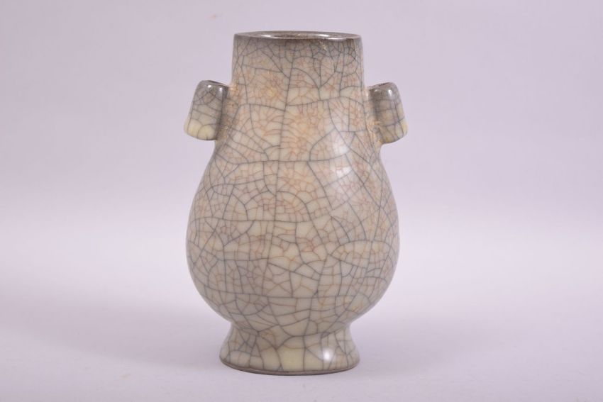 A CHINESE CRACKLE GLAZE TWIN HANDLE VASE, 17cm high.