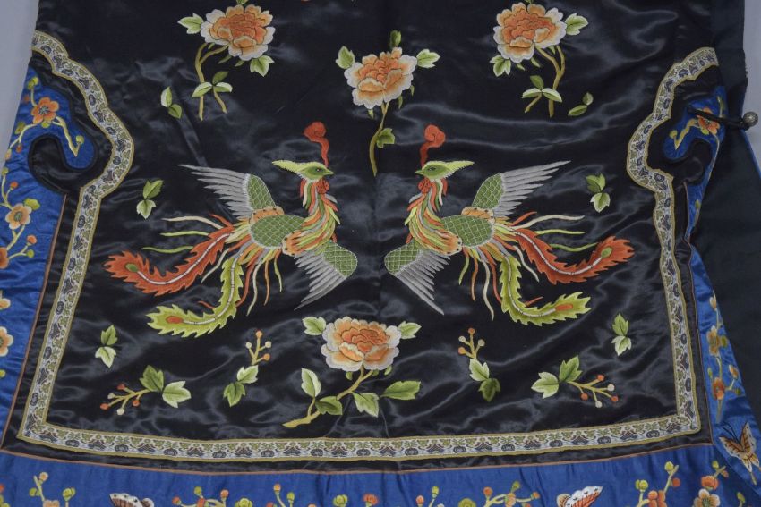 A GOOD CHINESE BLACK SILK ROBE, colourfully embroidered with exotic birds and flowers.