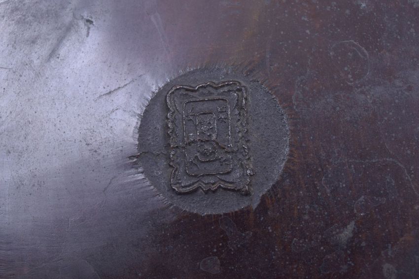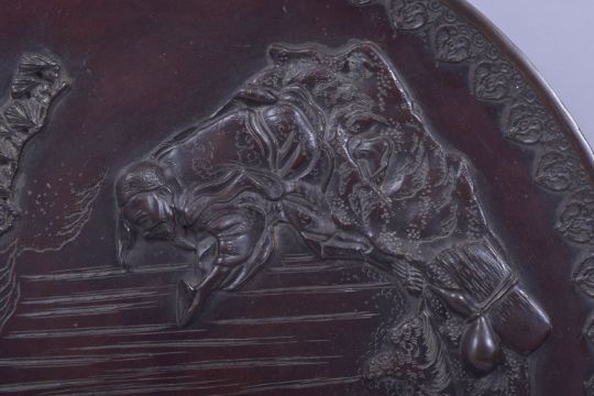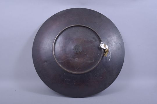 A LARGE AND HEAVY JAPANESE BRONZE CHARGER, with a relief depiction of a sennin below a tree with a double gourd, the reverse with a relief rectangular mark, 45cm diameter.
