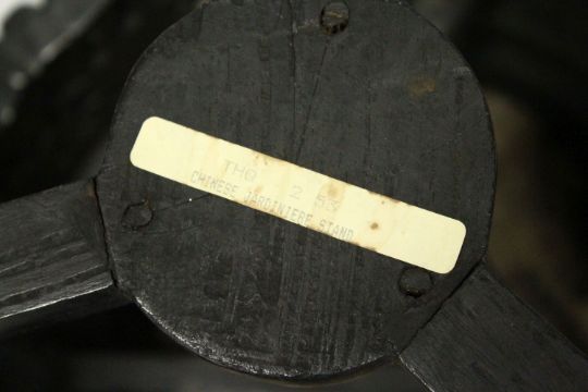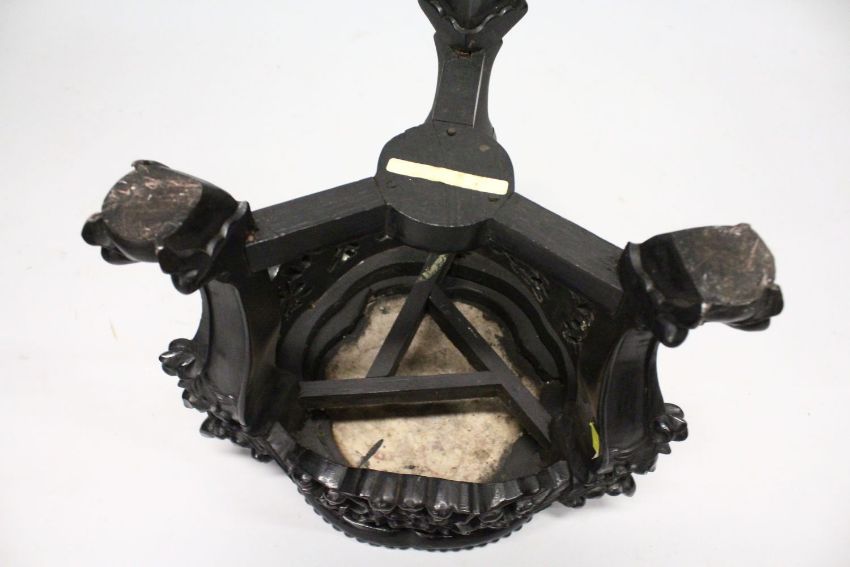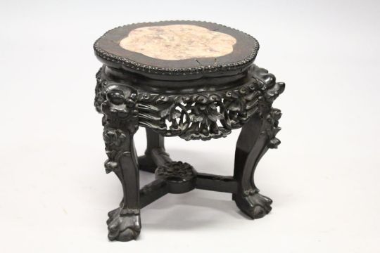 A SMALL CHINESE HARDWOOD AND MARBLE INSET STAND, with shaped top, carved and pierced frieze on three carved legs united by stretchers, 30cm diameter, 34cm high.