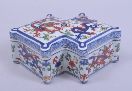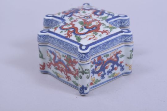 A CHINESE MING STYLE WUCAI OCTAGONAL FORM PORCELAIN BOX AND COVER, decorated with dragons, with glazed six character panel to base, 18cm wide.