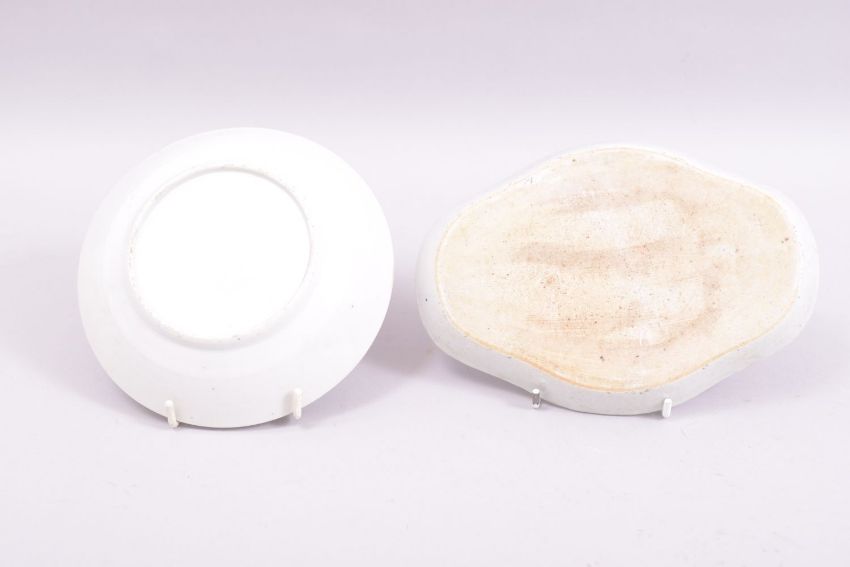 TWO SMALL CHINESE PORCELAIN DISHES, the circular dish painted with figures around a scroll, 14.5cm diameter, the other dish with figures in an outdoor setting, 18cm wide (2).