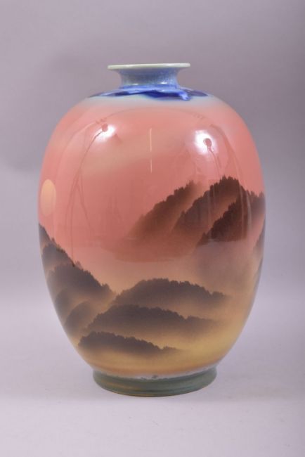 A LARGE JAPANESE PORCELAIN OVOID VASE, the body painted with an atmospheric sunset landscape, 33cm high.