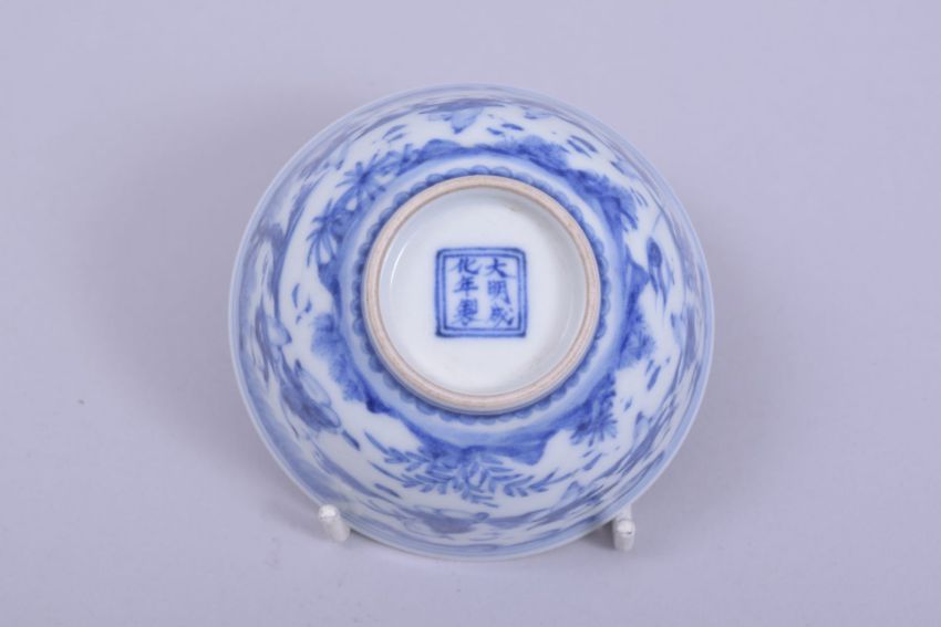 A CHINESE BLUE AND WHITE PORCELAIN TEA BOWL, the exterior painted with boys in a landscape, the interior with further central panel depicting boys, six character mark to base, 9cm diameter.