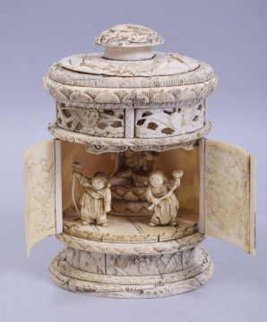 A JAPANESE MEIJI PERIOD CARVED IVORY BUDDHIST SHRINE, carved with immortal figures and openwork panels, doors opening to reveal a seated goddess and attendants, 16.5cm high (af).