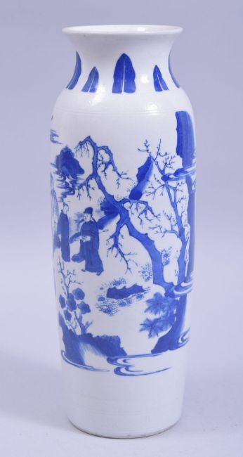 A CHINESE QING DYNASTY BLUE AND WHITE PORCELAIN VASE, decorated with figures in a landscape scene, 26cm high.