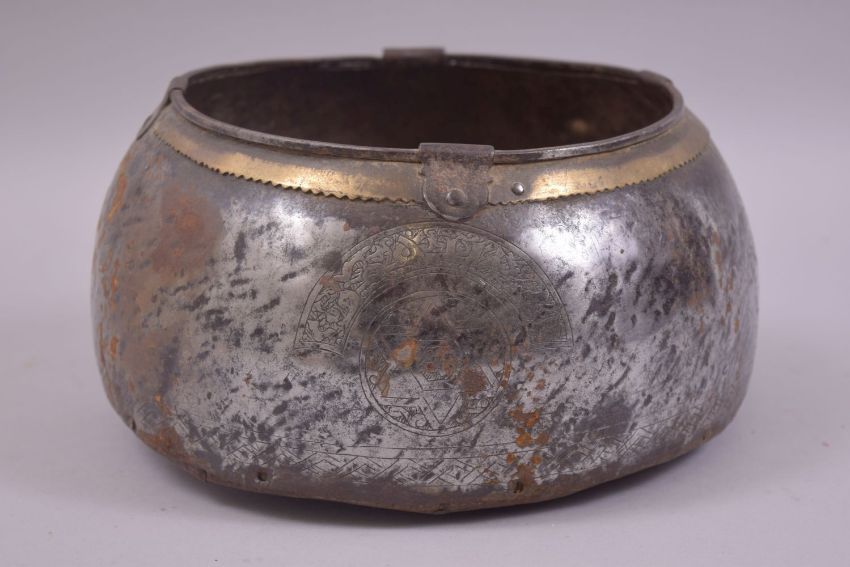 A 12TH/13TH CENTURY AYYUBID STEEL BOWL, with brass rim, engraved panels, (age related wear), 21cm diameter.