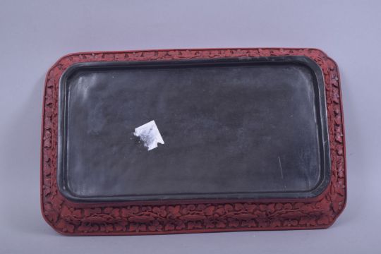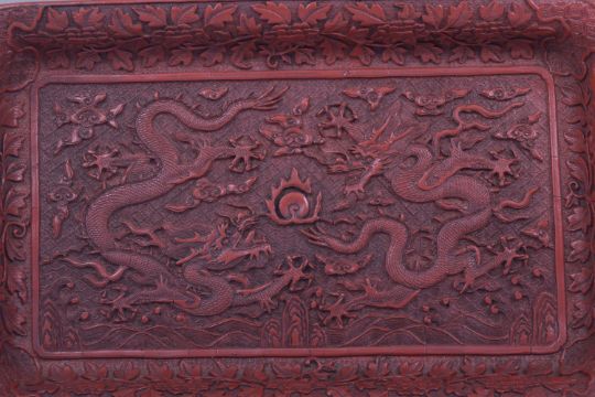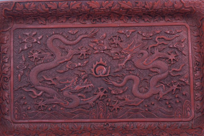 A 19TH/20TH CHINESE CINNABAR LACQUER RECTANGULAR TRAY, the centre with a panel of two dragons and the the pearl of wisdom amongst clouds and above stylised waves, borders with floral decoration, 30cm x 18.5cm.
