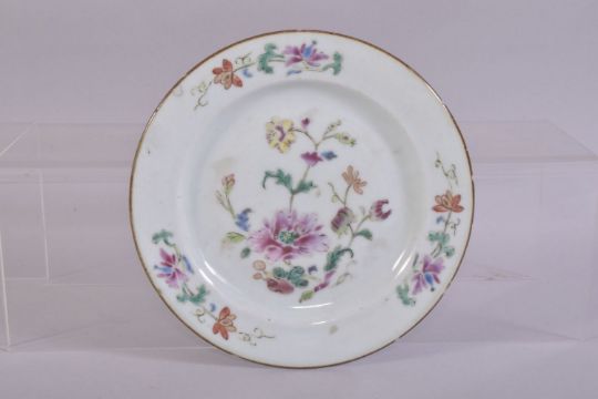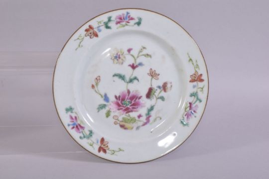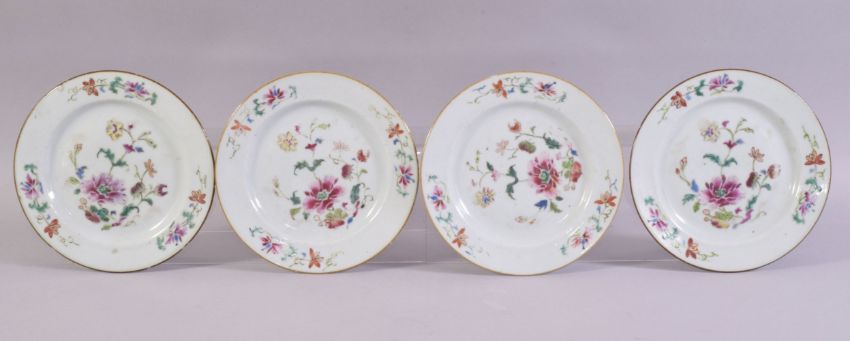 FOUR SMALL CHINESE FAMILLE ROSE PORCELAIN PLATES, each painted with a floral spray central, 16.5cm diameter.