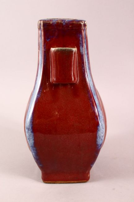 A CHINESE FLAMBE GLAZED PORCELAIN TWIN HANDLE VASE, 30cm.