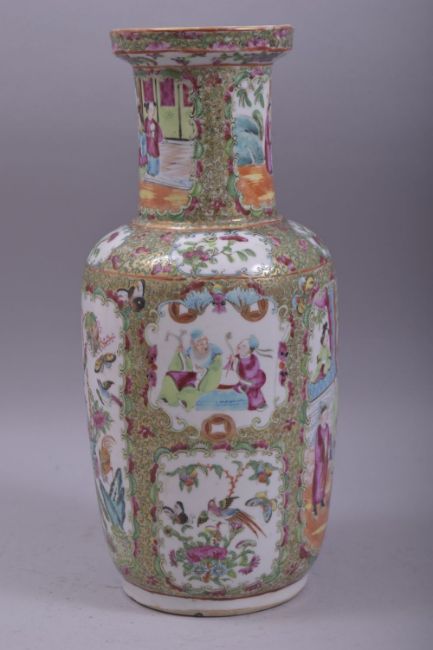 A CHINESE CANTON FAMILLE ROSE PORCELAIN VASE, painted with panels of figures as well as a panel of peacocks, with further panels of birds, butterflies and native flora, 34.5cm high.