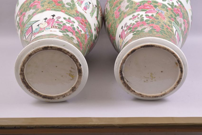 A LARGE PAIR OF CHINESE FAMILLE ROSE / VERTE PORCELAIN VASES, painted with panels of female figures and further decorated with large flower heads and foliage as well as butterflies, 61cm high.