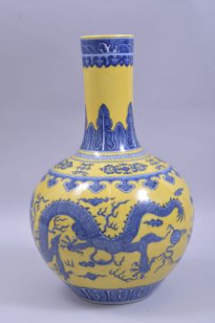 A CHINESE QING STYLE YELLOW GROUND PORCELAIN DRAGON VASE, the body decorated with blue dragons and the flaming pearl of wisdom amongst stylised clouds and flames, with six character mark to base, 37cm high.
