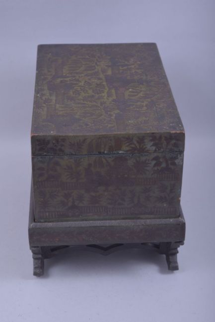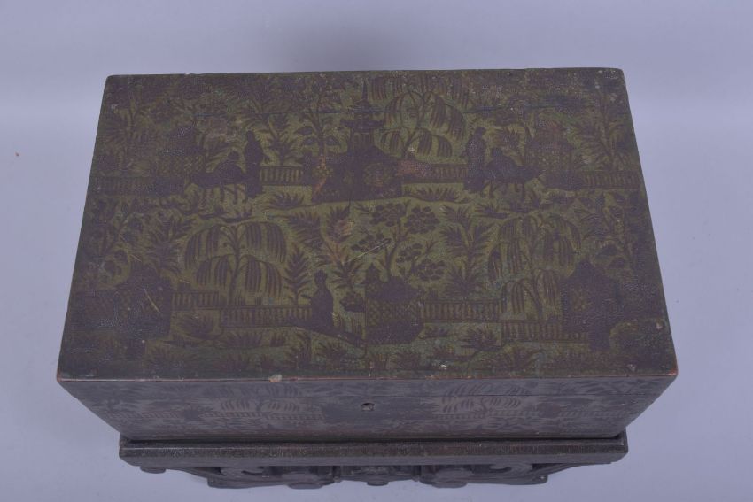 A FINE AND UNUSUAL EARLY 19TH CENTURY ANGLO INDIAN GILDED GREEN LACQUERED MINIATURE CHEST ON STAND, decorated with figures in a landscape setting, 35cm wide.