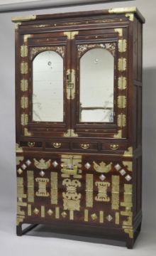 A CHINESE STAINED PINE AND MOTHER OF PEARL INLAID CABINET ON CHEST, comprising two large hinged doors above four small drawers, the doors inset with mirror panels, the cabinet on top of a hinged flap chest with pin lock, 184cm high, 103.5cm wide, 45.5cm deep.