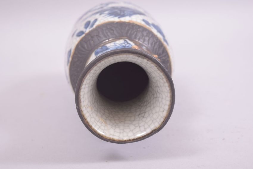 A SMALL CHINESE BLUE AND WHITE CRACKLE GLAZE VASE, painted with a bird, butterflies and native flora, with moulded naturalistic handles, mark to the base, 20.5cm high.