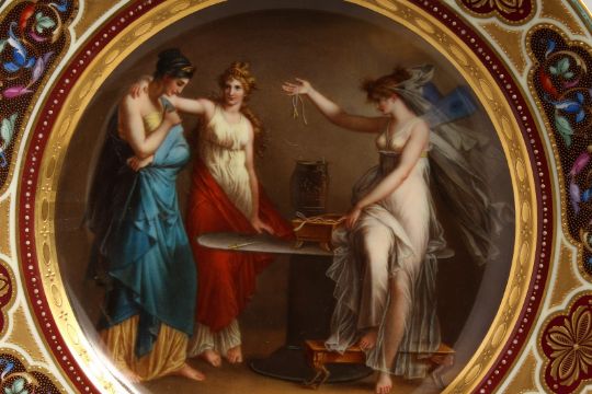 A VERY GOOD 19TH CENTURY VIENNA CIRCULAR PLATE with high quality painting and gilding, the centre with three classical females. 'Psyche'.