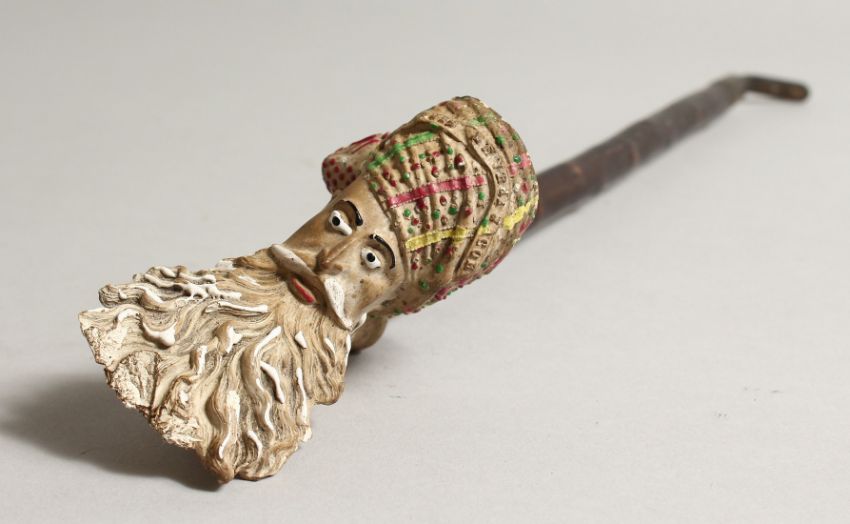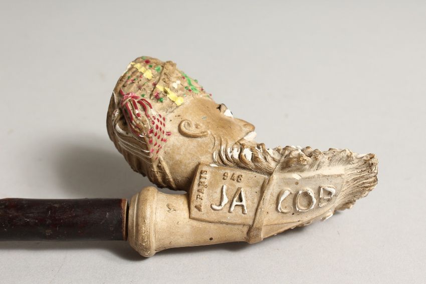 A FRENCH CLAY PIPE OF THE HEAD OF A TURK. 3ins, with wooden mouthpiece.