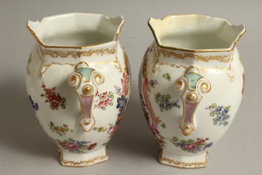 A PAIR OF MEISSEN DESIGN PORCELAIN TWO HANDLED VASES.
