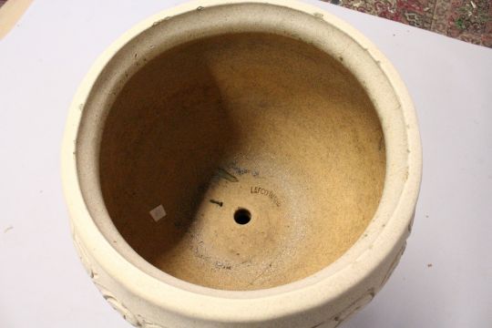 A LEEDS FIRE CLAY LEFCO WARE, STONE WARE JARDINIERE AND STAND, the ovid bowl with scrolls