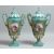 A VERY GOOD PAIR OF 19TH CENTURY SEVRES PORCELAIN TWO HANDLED URN SHAPED VASES AND COVERS, blue ground edged in gilt and painted with reverse panels of flowers and birds.